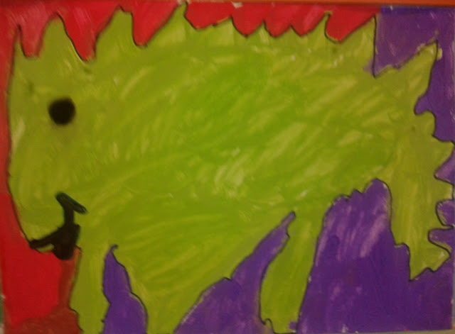 Aquest Sant Jordi hem perdut la por i hem pintat cavallers, princeses i dracs directament amb pintura, sense dibuixar prèviament amb llapis. Un cop sec hem resseguit alguns traços amb retolador per tal que quedessin més marcats. A vegades també va bé que no puguin corregir el que han fet.