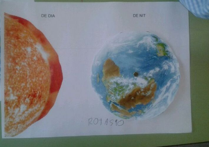 Finalment ho han representat sobre el paper. Han retallat el planeta Terra que enganxat al full amb un enquadernador podrà fer el moviment de rotació, i d'aquesta manera han pogut observar com una part de la Terra a vegades està davant del Sol i altres vegades està al darrera. Després hi han enganxat paper de cel·lofana de color taronja sobre la part de la Terra on serà de dia i paper de cel·lofana blau sobre la part on serà de nit. Per acabar han assenyalat amb un gomet on vivim i així han pogut observar com al girar la posició canvia i han entès com és que es fa de nit i de dia.